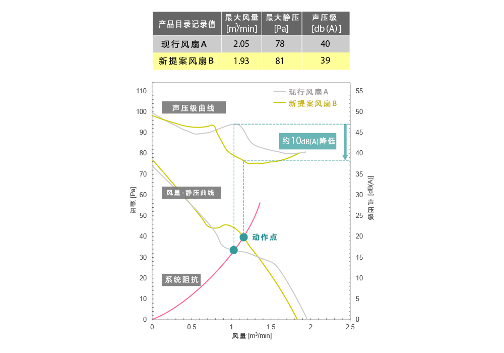 “山洋电气建议使用 B 风扇。并说明:产品目录上的数值,看起来是比现行风扇 A 的性能好,但在实际的动作点上,风扇 B 的风量及静压更大,而且噪音也更低。”(A 先生)